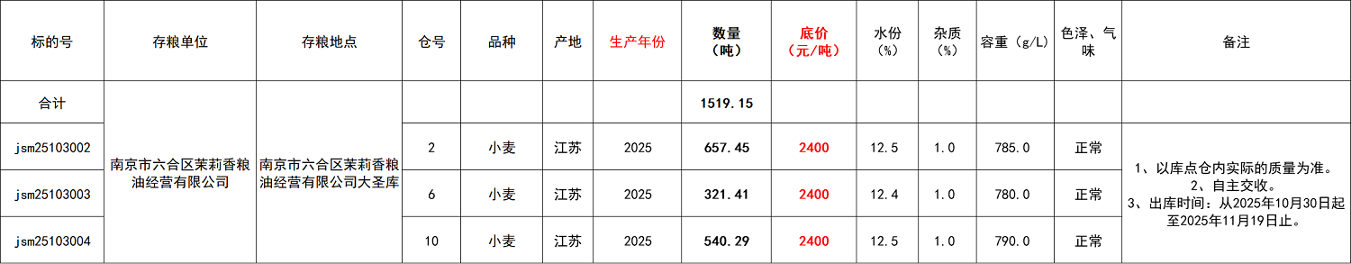 买卖双方自主完成交割(双方自行承担资金安全责任,自行采取有效措施防范交割风险),买受人凭成交合同,凭身份证明带款或有效汇款凭证到卖方指定库点提货,交割完成后买卖双方凭双方确认单到交易市场退保证金(保证金不冲抵货款,待合同履约结束后统一释放)。交割期为从2025年10月30日起至2025年11月19日止,交款期为从2025年10月30日起至2025年11月19日止。