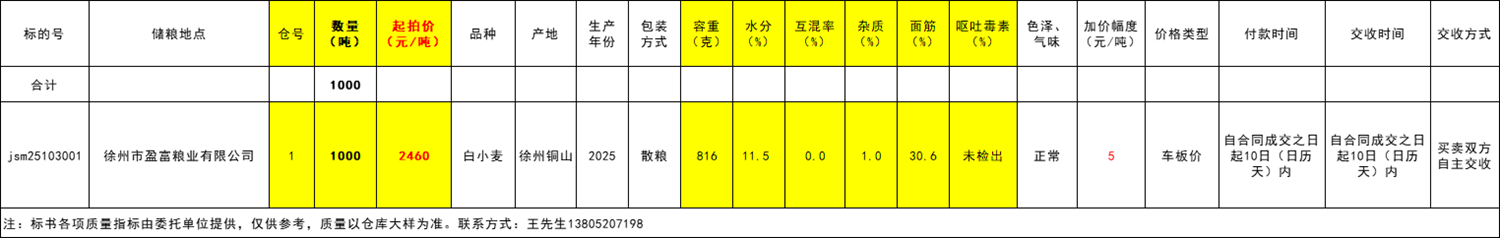 受******有限公司委托,江苏粮油商品交易市场原定于2025年10月30日 10:15举办(商品粮)小麦竞价销售交易活动。现委托方申请变更交易数量为:1000吨,共1个标段;质量变更详见交易清单(更新);价格变更为:2460元/吨;仓号变更为1号仓。其他事项如原公告公示不变,特此说明。