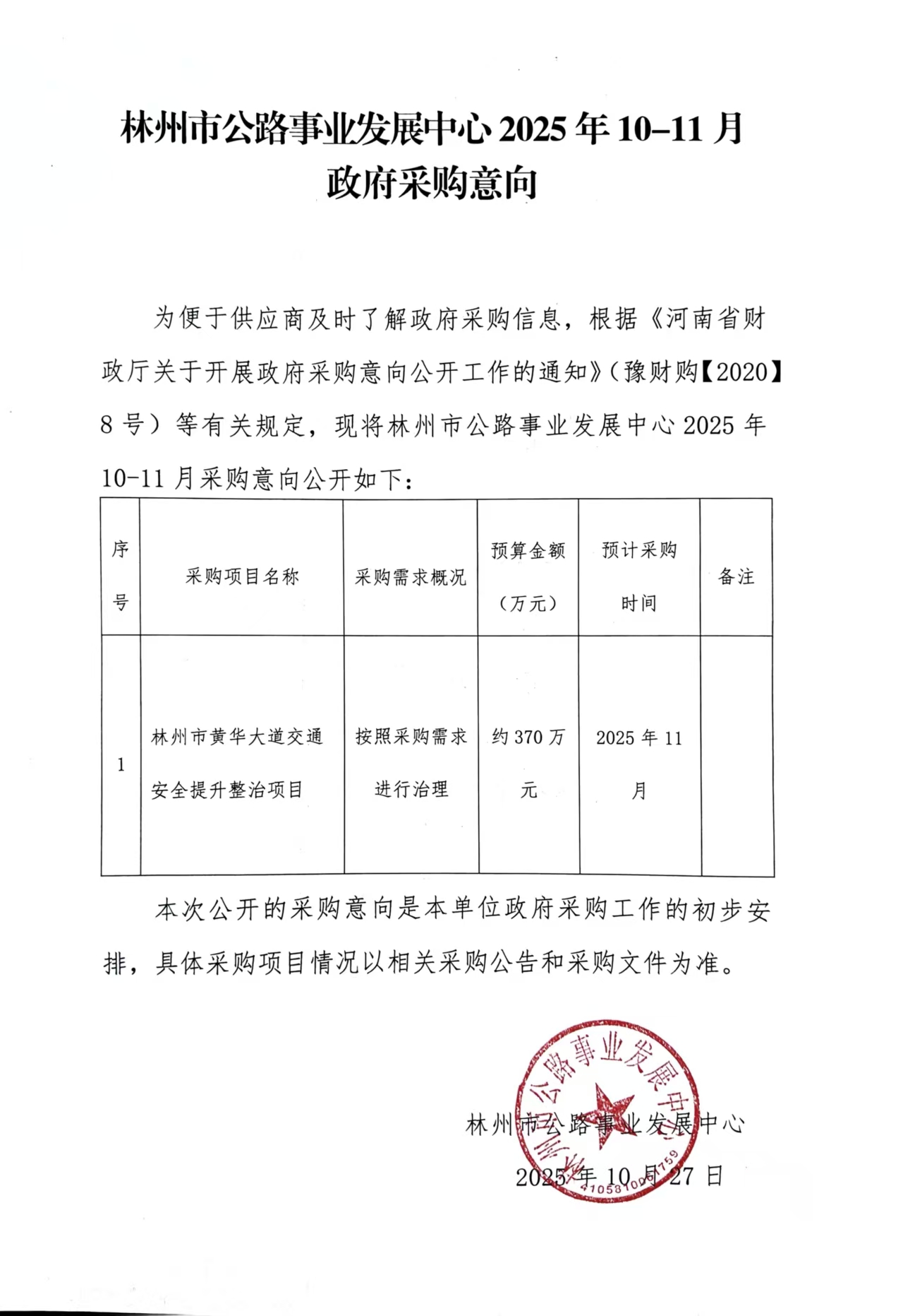 为便于供应商及时了解政府采购信息,根据《河南省财政厅关于开展政府采购意向公开工作的通知》(豫财购〔2020〕8号)等有关规定,现将林州市公路事业发展中心 2025年10(至)11月采购意向公开如下: